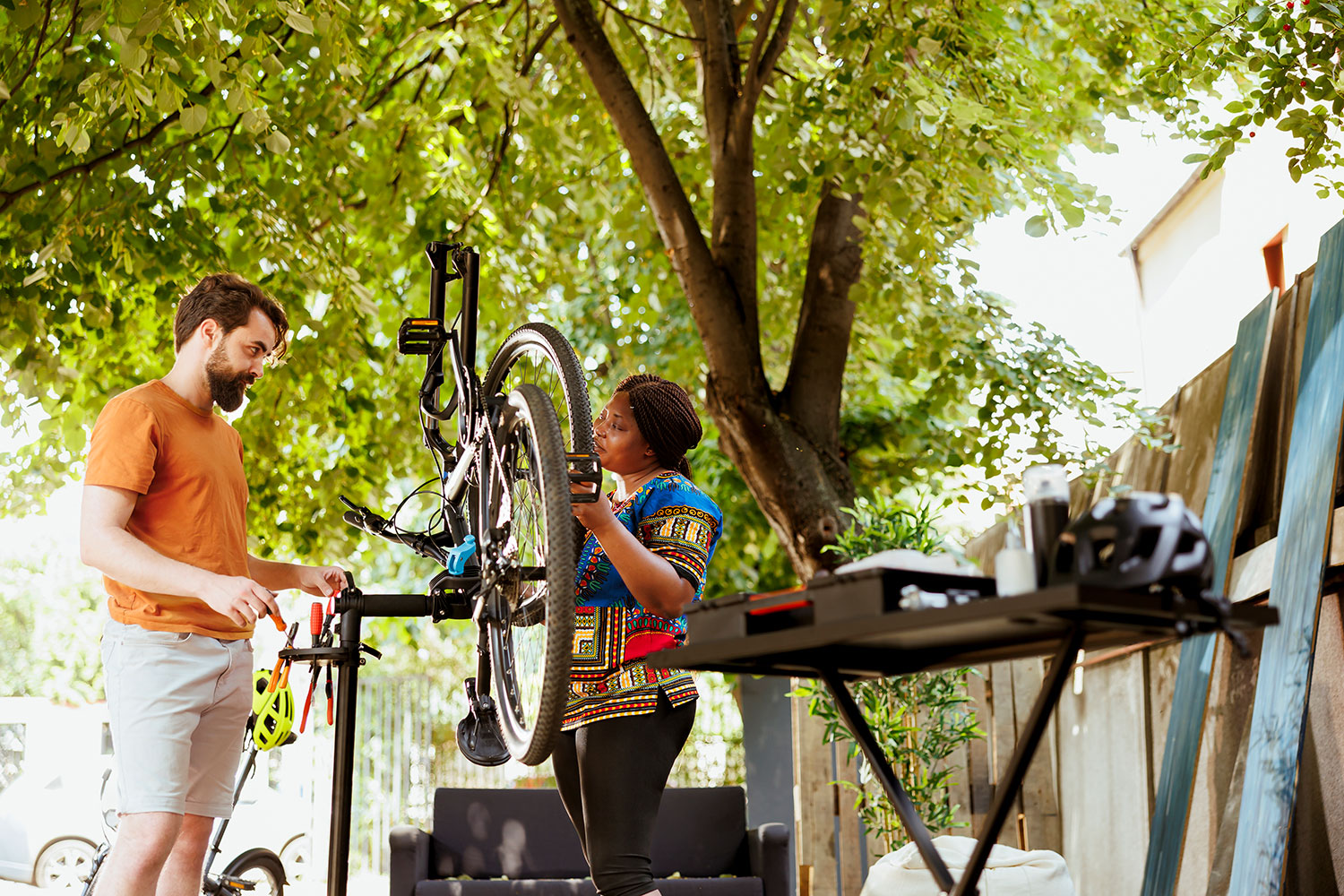 Zwei Menschen reparieren zusammen ein Fahrrad