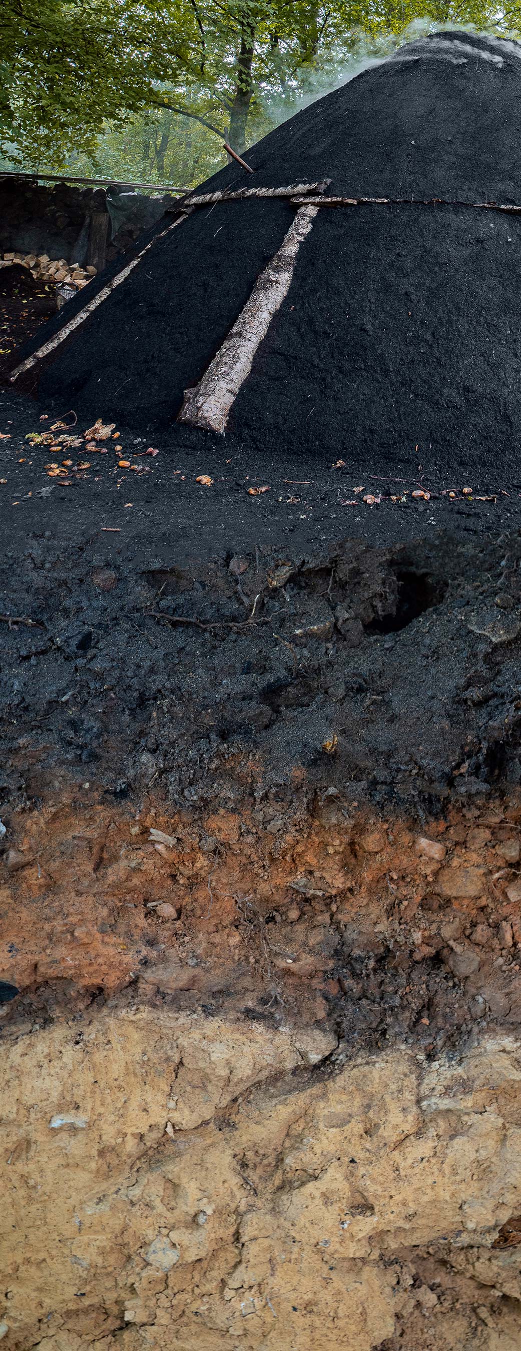 Böden sind unsere Lebensgrundlage. Sie produzieren Nahrungsmittel, tragen uns, binden Kohlendioxid, speichern und reinigen Wasser zugleich. Darüber hinaus sind sie Archive der Natur- und Kulturgeschichte: In ihren Schichten lassen sich Hinweise auf die Entwicklung unserer Landschaft und das Wirken des Menschen über Jahrhunderte hinweg ablesen: Meilerböden (wie auf dem Bild) sind in fast allen hessischen Mittelgebirgsregionen anzutreffen. Bis Mitte des 19. Jahrhunderts waren Holz und Holzkohle die wichtigsten Energieträger. Zur Erzverhüttung und Eisenverarbeitung wurden enorme Mengen benötigt. Kohlenmeilerböden haben einen schwarzen, holzkohlereichen Oberboden. Der Boden unter dem Kohlenmeiler wurde durch die hohen Temperaturen „gebrannt“ und das im Boden enthaltene Eisen in das rötliche Eisenoxid Hämatit umgewandelt.